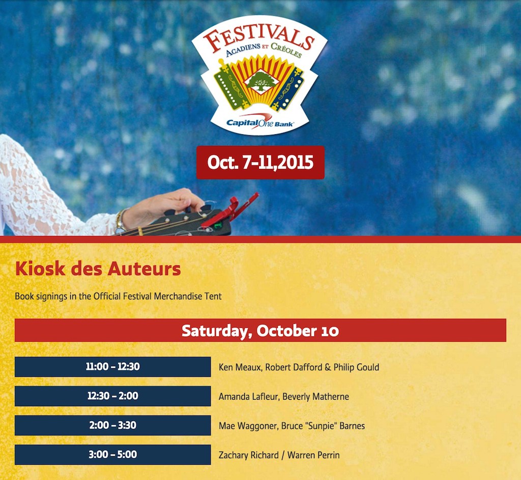 September 9. As Guest of Honor of the Sebastopol Rotary Club, Beverly will give a presentation on Cajun history and read / perform her poetry in Cajun French and English, to set the tone for the Cajun Zydeco Festival in Ives Park at 7400 Willow Street.